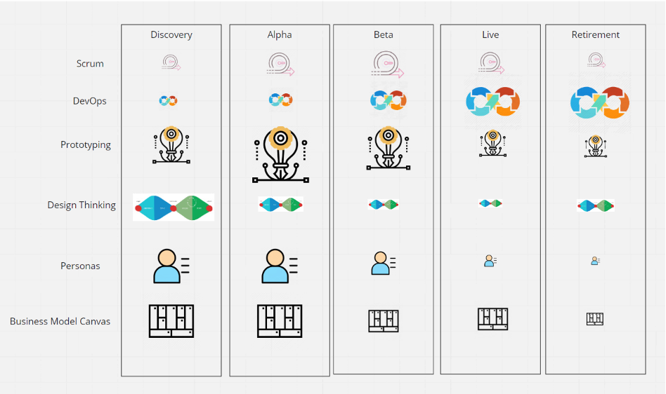 In der Grafik oben ist die relative Bedeutung dieser Methoden im Lebenszyklus eines Produkts dargestellt.
